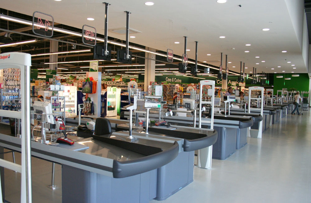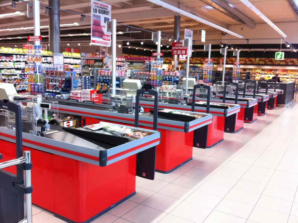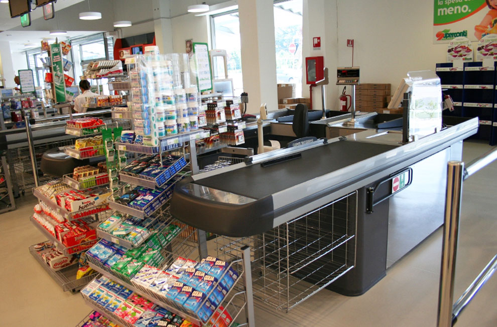 Banchi cassa Banco cassa in metallo con nastro, disponibili in diverse dimensioni per supermercati, ipermercati, discount, ingrosso, cash & carry. Mobili cassa statici per negozi e minimarket, configurabili e personalizzabili con accessori. |