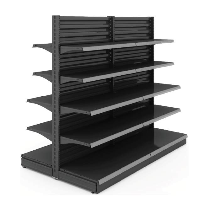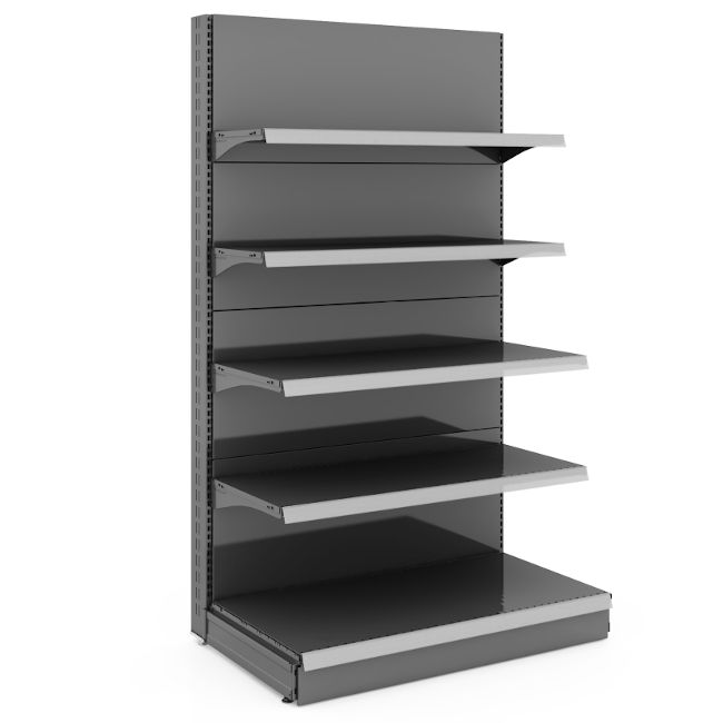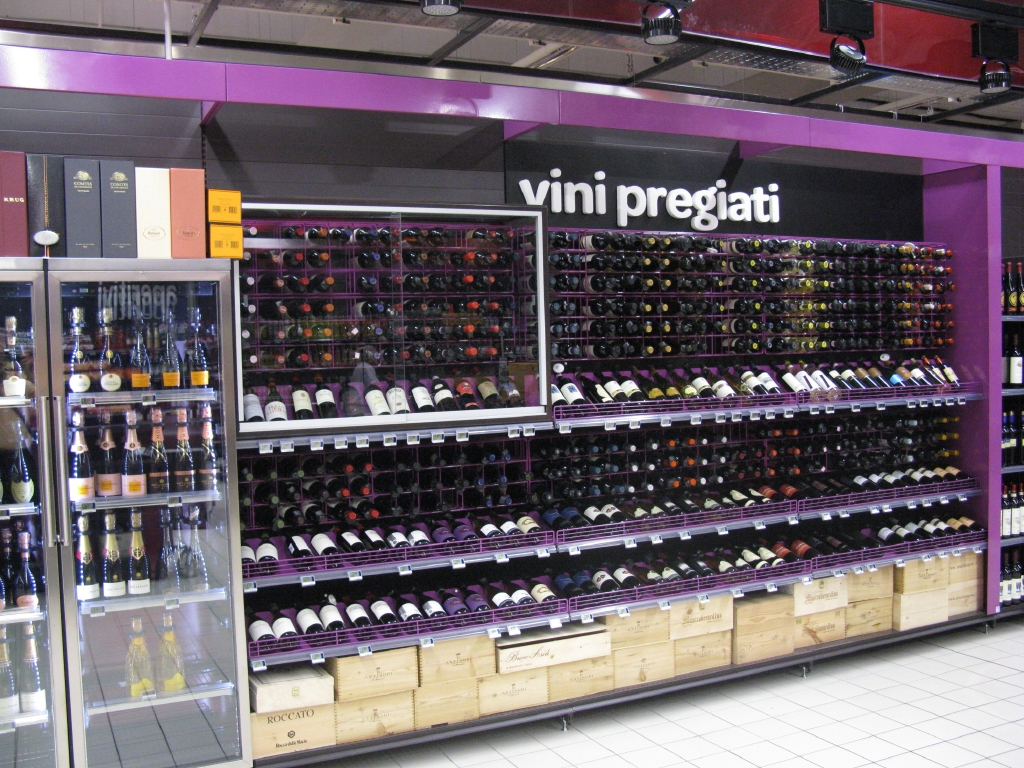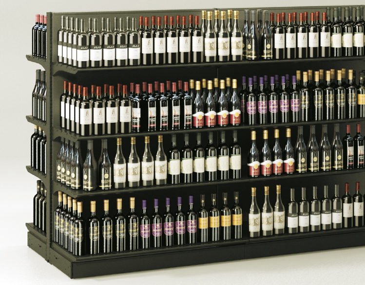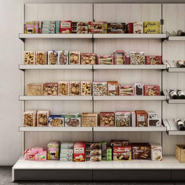 Scaffali murali e gondole in metallo per supermercati e negozi per l'esposizione di alimentari, vino, pane, parafarmacia e no food. Scaffalature modulari personalizzabili per altezza, ripiani, finiture, ecc.