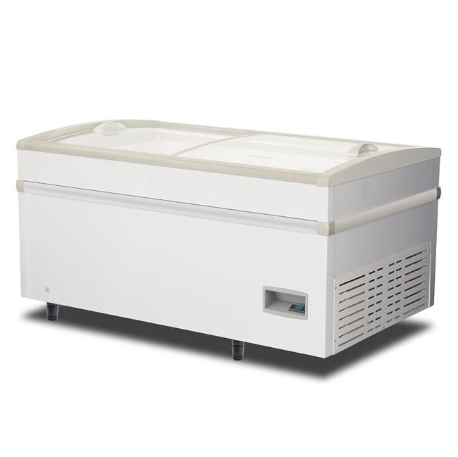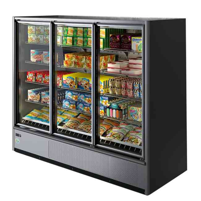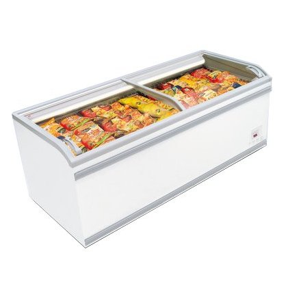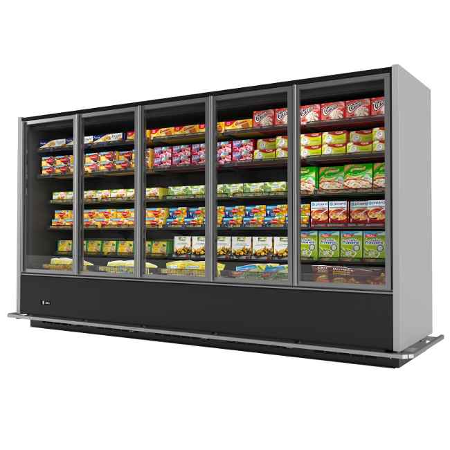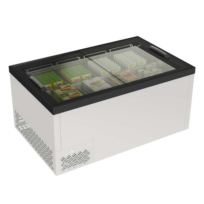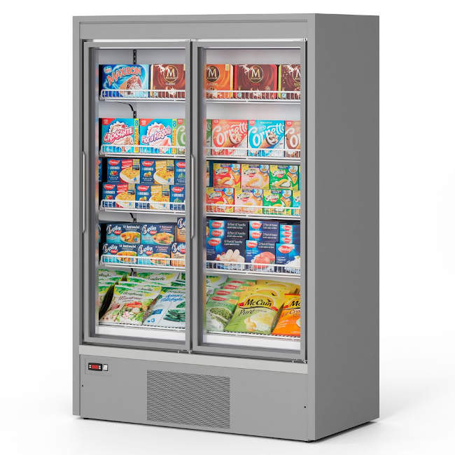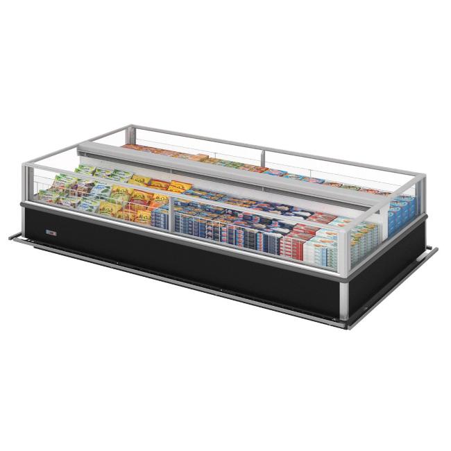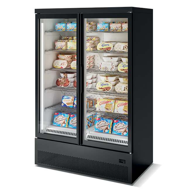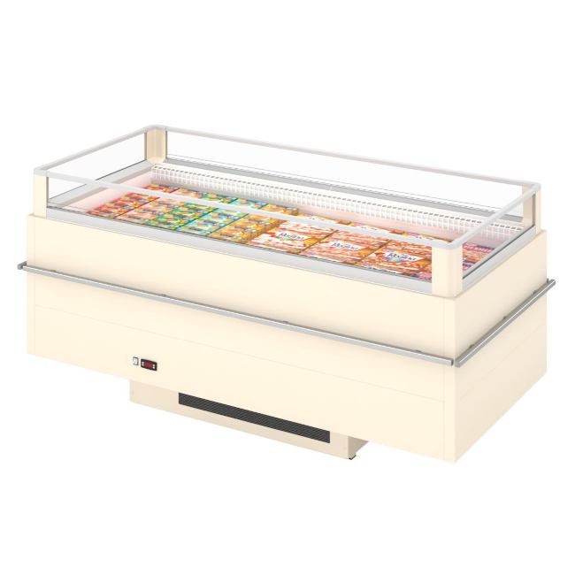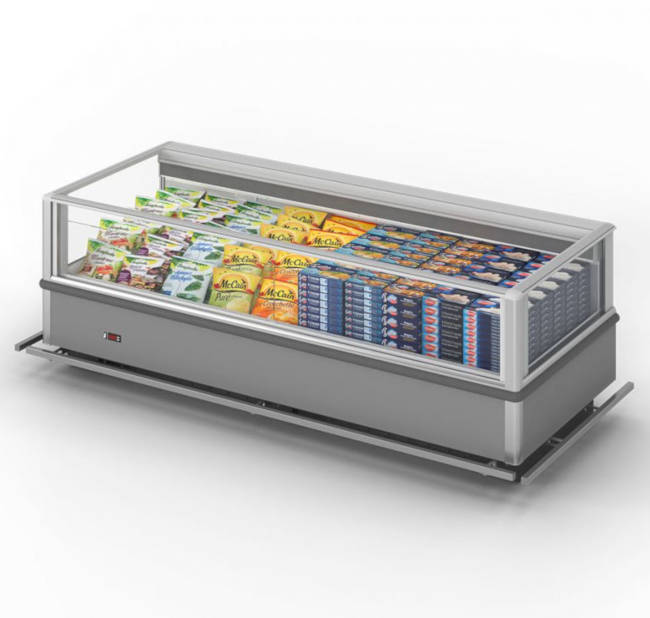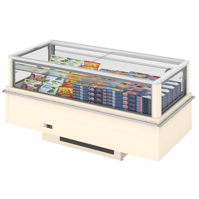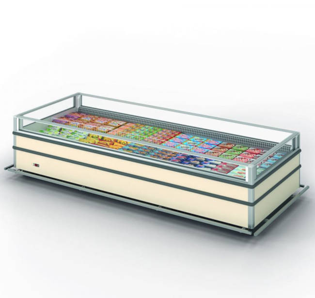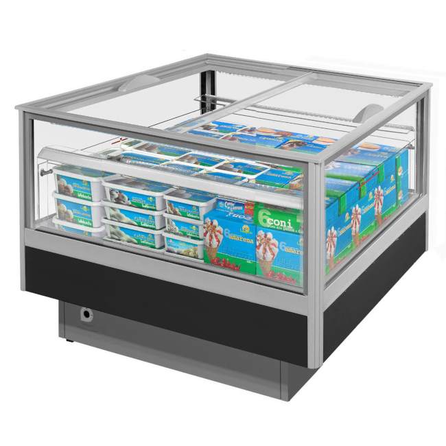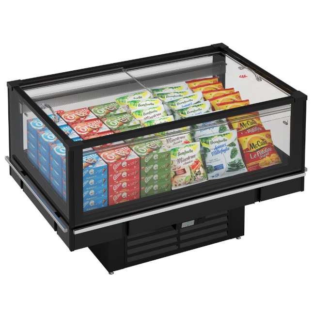 Isole refrigerate orizzontali BT a temperatura negativa per l'esposizione di surgelati e gelati, con o senza gruppo. Murali freezer con porte e isole chiuse con coperture scorrevoli in vetro per un minor consumo energetico.