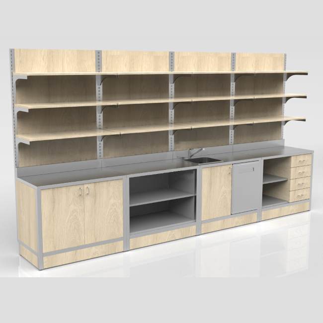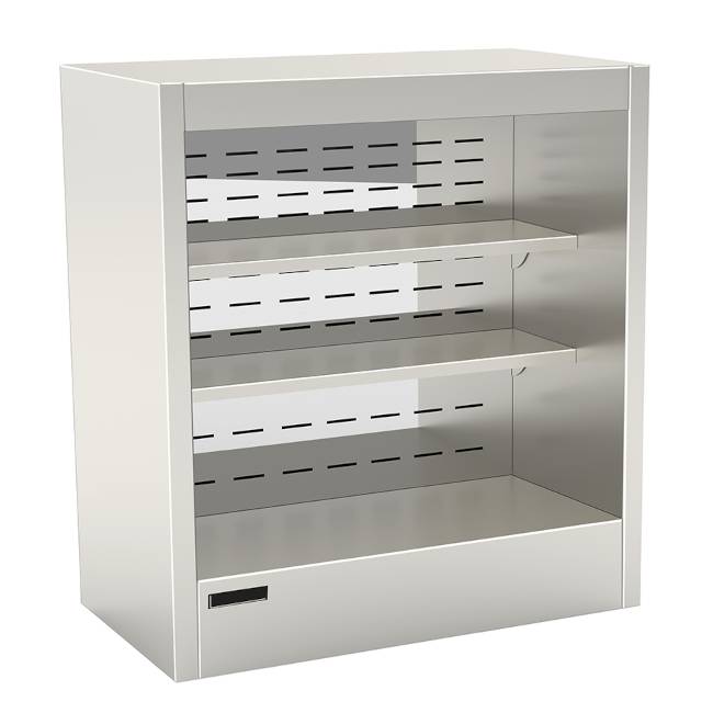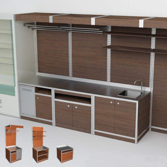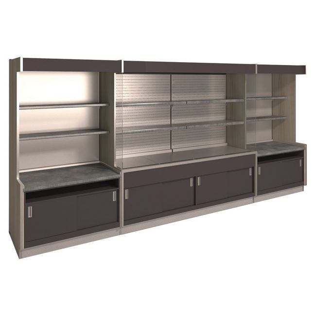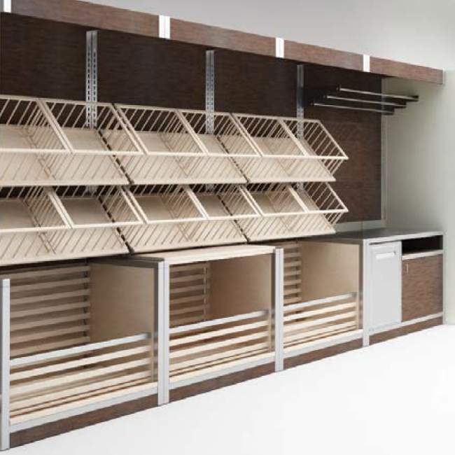Arredi modulali per Retrobanchi neutri o refrigerati per negozi, supermercati, panetteria. Espositori refrigerati pensili salumeria sospesi e da appoggio.