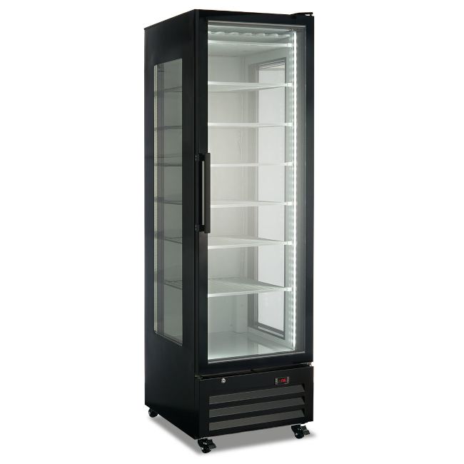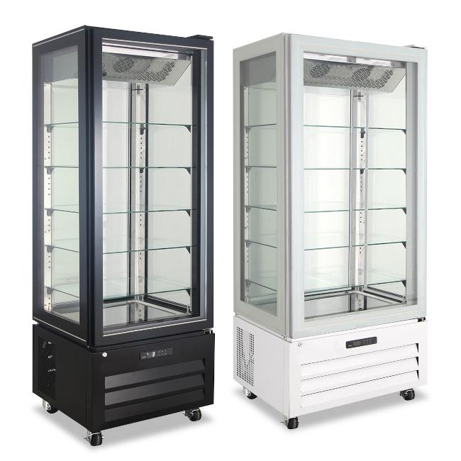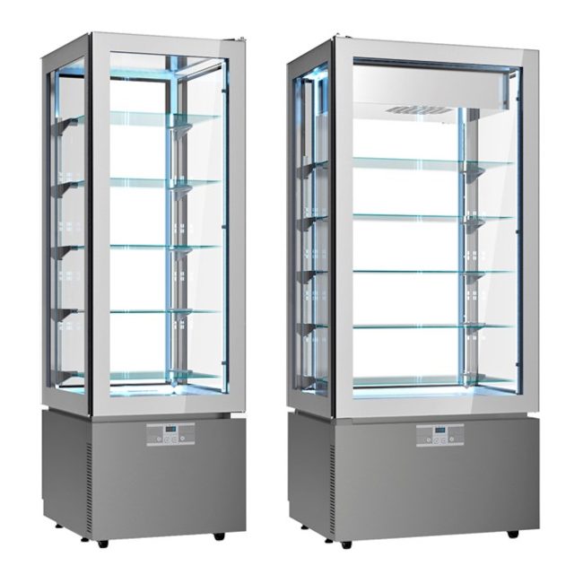Vetrine verticali panoramiche freezer per esposizione gelato e pasticceria surgelata.
