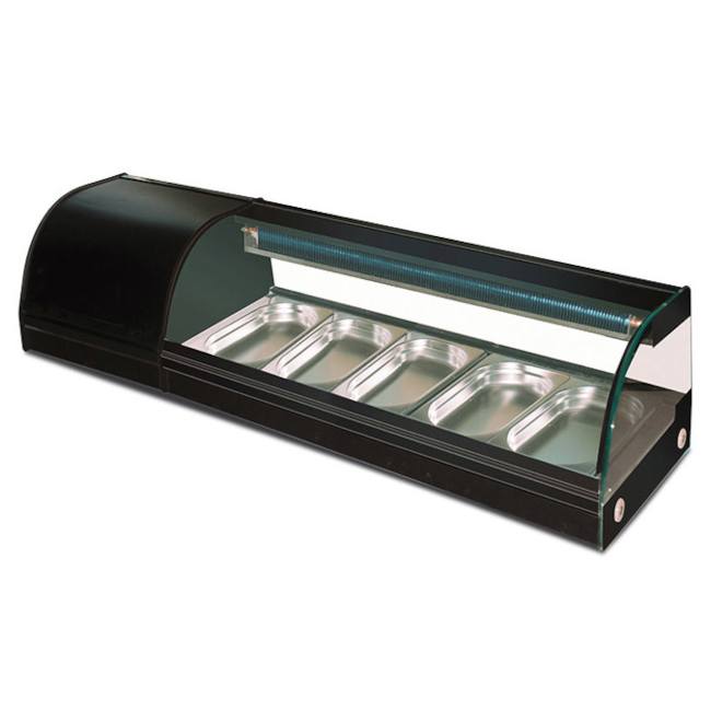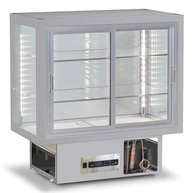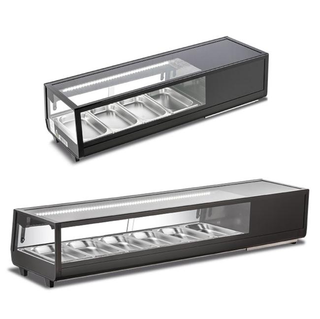 Vetrine espositive da appoggio banco refrigerate o calde per gastronomia, snacks, dessert.