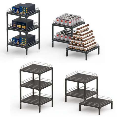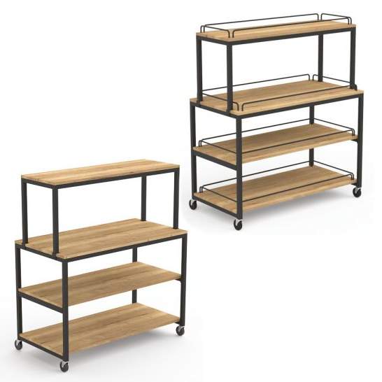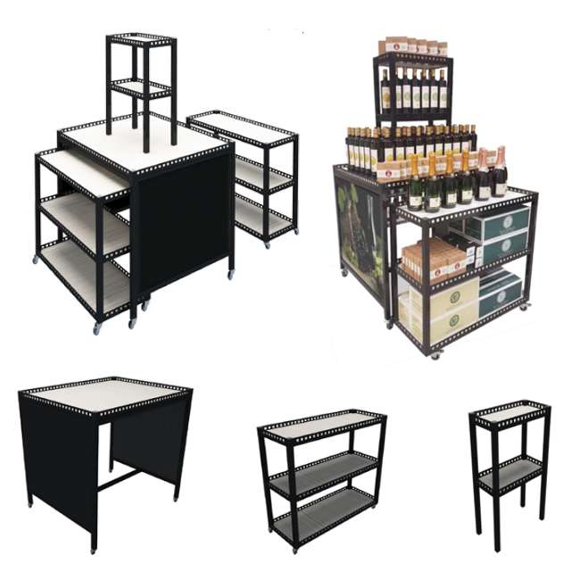 Espositori promozionali per prodotti alimentari e non. Tavoli, banchi componibili multifunzione utilizzabili nei vari reparti supermercato e fiere.